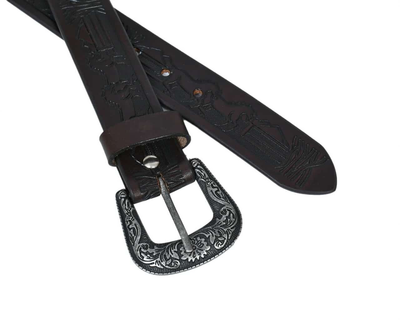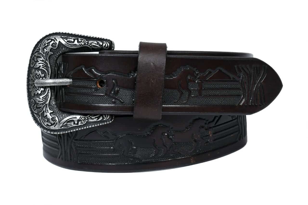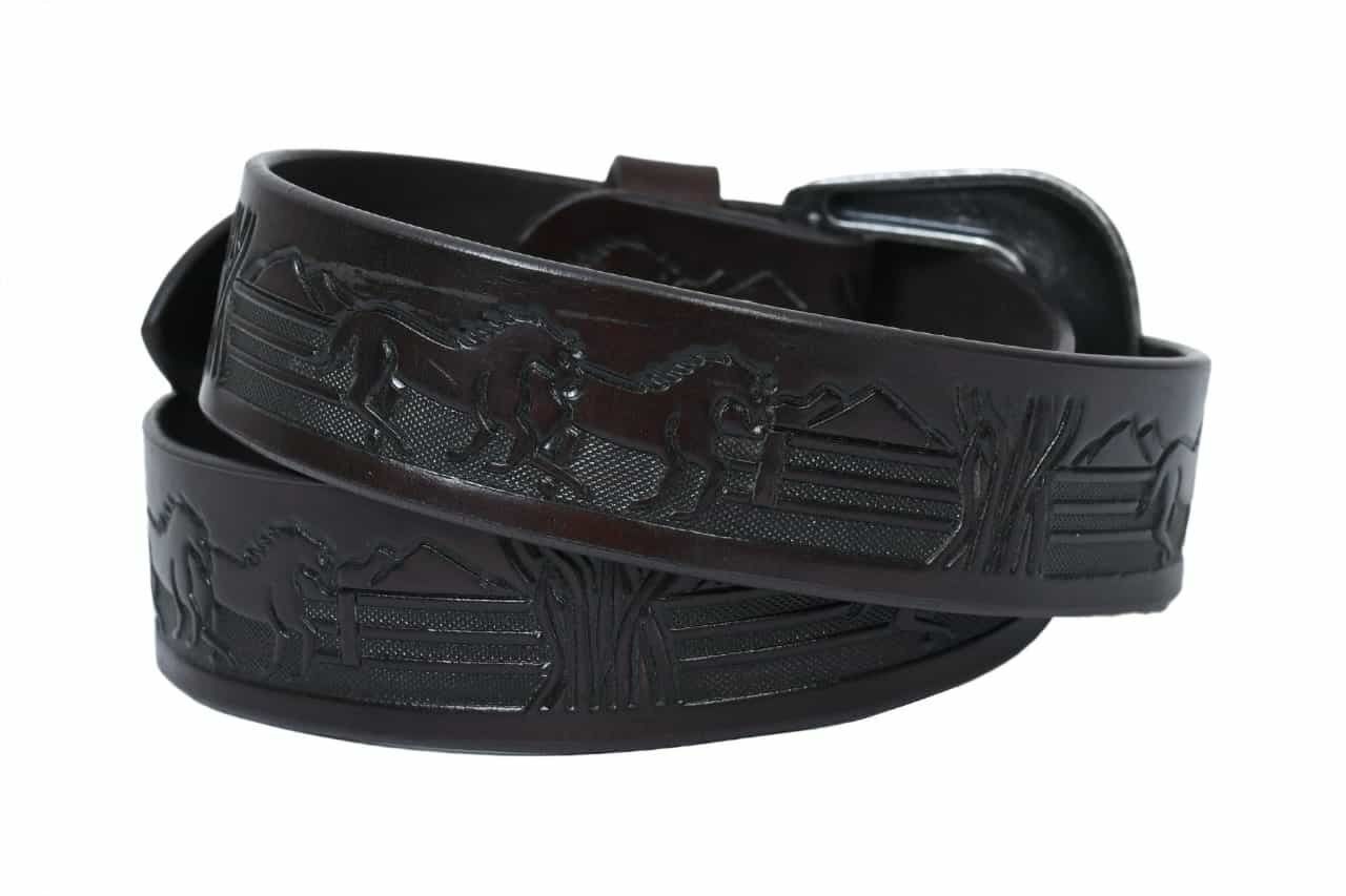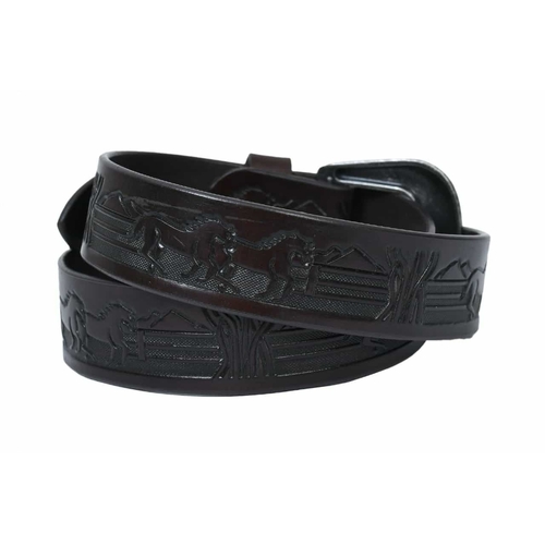 This beautifully crafted TAN leather belt with embossed running horses.